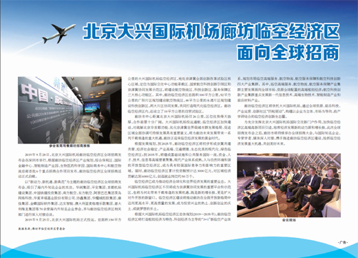 2019年9月28日,北京大兴国际机场廊坊临空经济区全球招商发布会在深圳市举行,根据廊坊临空经济区产业规划,综合保税区、国际金融中心、智能制造产业园、生物医药科学园、国际商务中心和航空物流总部首批6个重点招商合作项目发布,廊坊临空经济区全球招商活动正式启帷。