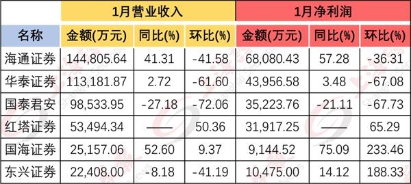 华泰证券(18.260, 0.10, 0.55%)1月的营收与净利润则与去年同期基本持平,暂居第二。暂居第三的国泰君安(16.770, -0.08, -0.47%)营收、净利则较去年同比下降。