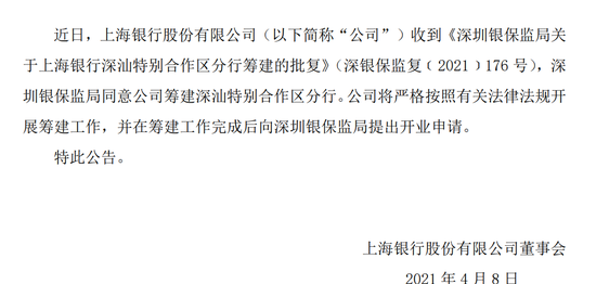 4月7日消息,上海银行发布公告称,深圳银保监局同意公司筹建深汕特别合作区分行。公司将严格按照有关法律法规开展筹建工作,并在筹建工作完成后向深圳银保监局提出开业申请。