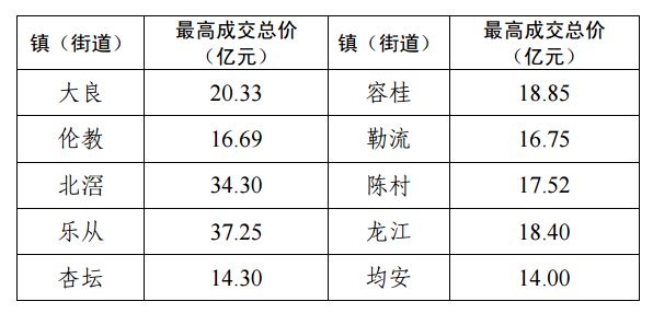 按照《征求意见稿》,目前顺德土地成交价最高为乐从镇,单宗商住地成交价最高为37.25亿元,北滘镇次之,为34.3亿元,大良街道地块最高价格20.33亿元;其他镇街的地块最高限价均在20亿元以下。