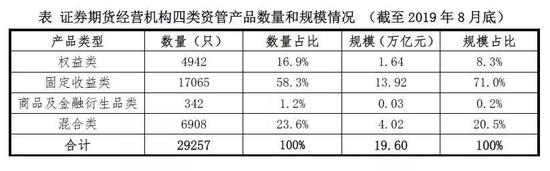 8日晚间,中国基金业协会公布了《证券期货经营机构资管产品备案月报(2019年8月)》,截至2019年8月底,证券期货经营机构私募资管业务管理资产规模合计19.60万亿元(不含社保基金、企业年金以及券商大集合),较7月底减少3556亿元,减幅1.9%。相较去年底的整体规模减少了3.06万亿,不过去年底数据包含了大集合产品规模,即便将这部分产品剔除,依然减少了2万亿以上。