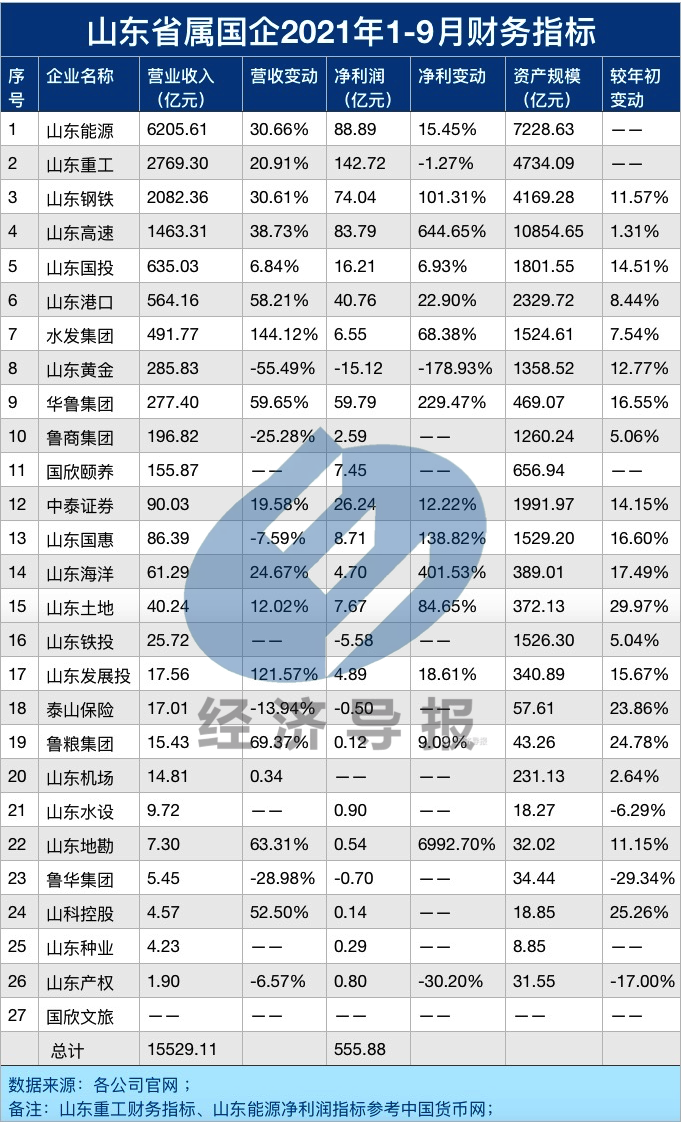 经济导报记者梳理发现,山东能源、山东重工、山东钢铁、山东高速这4家省属国企2021年前三季度营收规模均过千亿大关,组成了“山东省属国企营收千亿俱乐部”;其净利润也相当可观,均超70亿元。