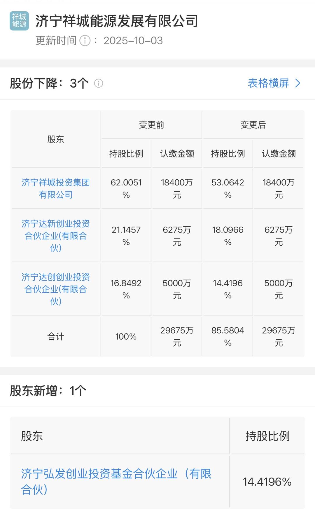济宁祥城能源发展有限公司(下称“祥城能源”)近日披露称,完成了A+轮融资,投资方为山东科创投资有限公司(下称“山东科创”)。尽管融资金额未披露,但10月3日,祥城能源注册资本从29675万元增加到34675万元,增加了5000万元。