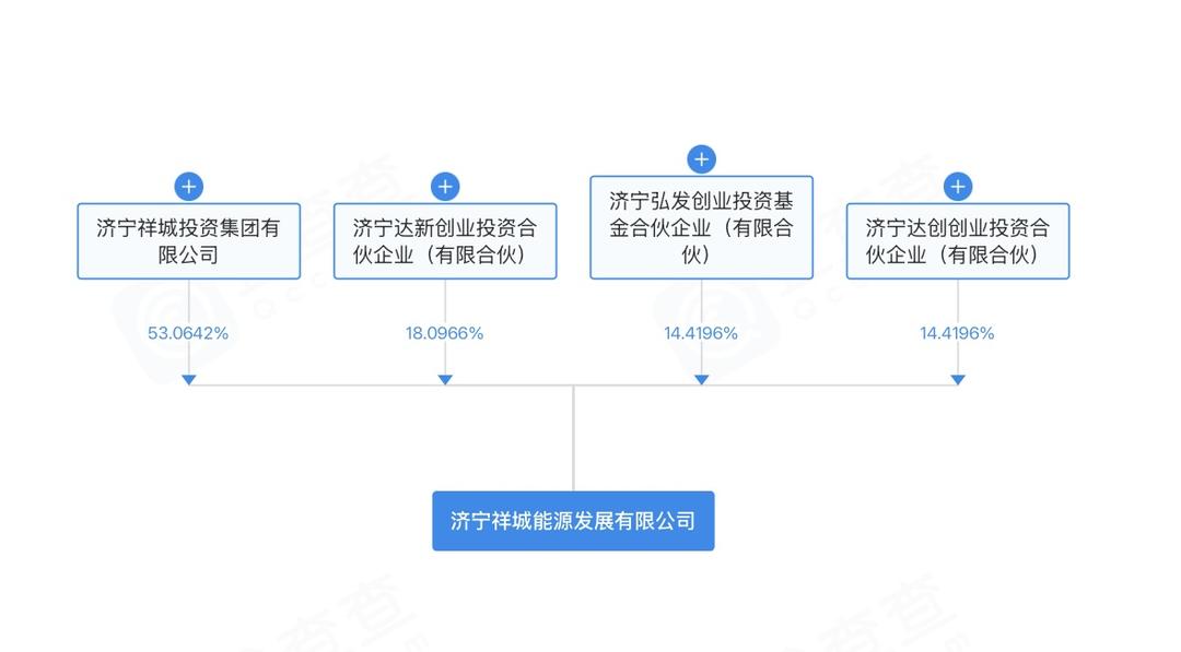 股权穿透显示,祥城能源有4个股东,分别为:济宁祥城投资集团有限公司(持股53.0642%)、济宁达新创业投资合伙企业(持股18.0966%)、济宁达创创业投资合伙企业(持股14.4196%)、济宁弘发创业投资基金合伙企业(持股14.4196%)。