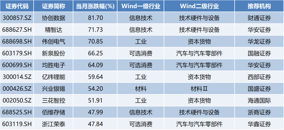 国融证券推荐的新泉股份(603179.SH)、华安证券推荐的均胜电子(600699.SH)的表现也不错,当月涨幅均超过60%,分别为66.25%、64.09%。