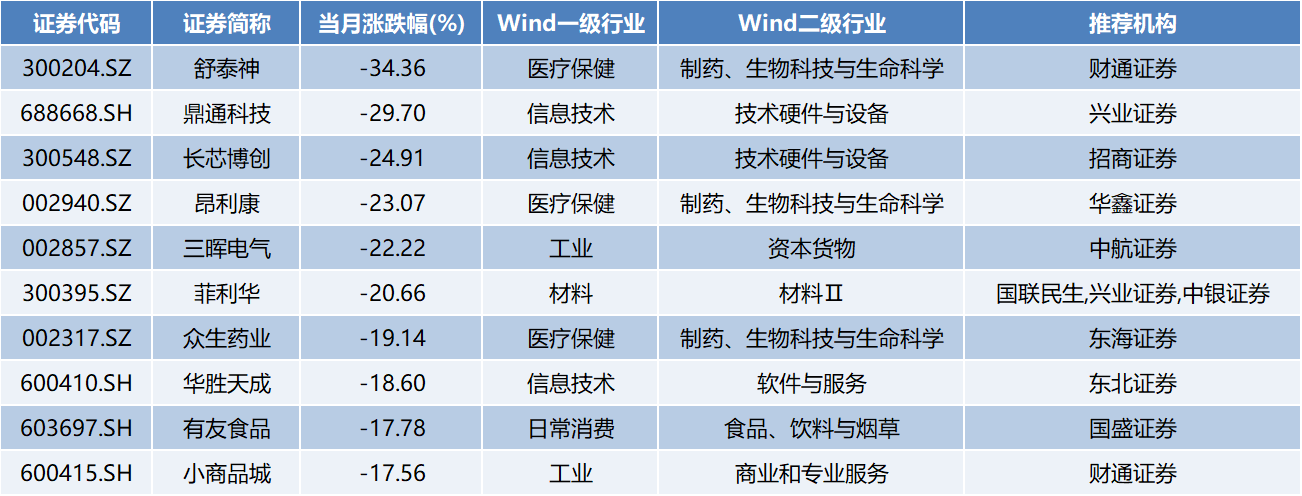 舒泰神为9月跌幅最大的金股,下跌34.36%,其也为押中“龙头股”的财通证券所荐。兴业证券推荐的鼎通科技(688668.SH)、招商证券推荐的长芯博创(300548.SZ)、华鑫证券推荐的昂利康(002940.SZ)、中航证券推荐的三晖电气(002857.SZ)分别跌逾29%、24%、23%、22%。