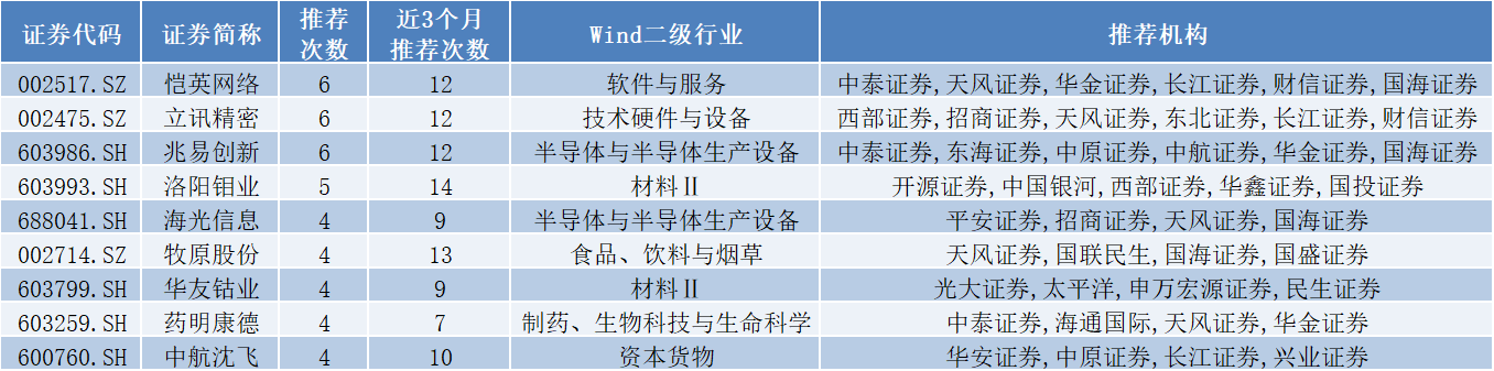 较受青睐的金股还有海光信息(688041.SH)、牧原股份(002714.SZ)、华友钴业(603799.SH)、药明康德(603259.SH)、中航沈飞(600760.SH),均被推荐了4次。