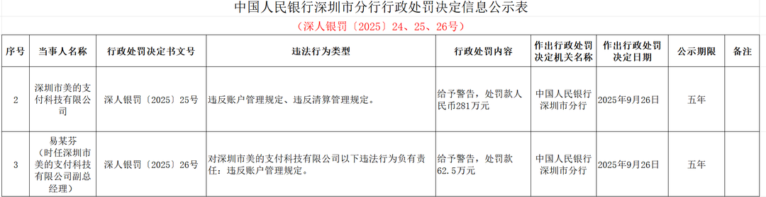 行政处罚决定信息公示表(深人银罚〔2025〕25、26号)显示,因违反账户管理规定、违反清算管理规定,美的支付被给予警告,并处罚款人民币281万元。此外,时任该公司副总经理易某芬因对深圳市美的支付科技有限公司违反账户管理规定负有责任,给予警告,处罚款62.5万元。