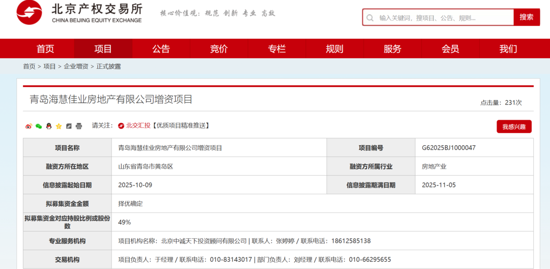 近日,青岛海慧佳业房地产有限公司(下称“青岛海慧佳业”)增资项目在北京产权交易所挂牌,青岛海慧佳业的大股东为济南中海地产投资有限公司(下称“济南中海地产”),持股比例为100%。增资完成后,融资方原股东持股51%,投资方持股49%。