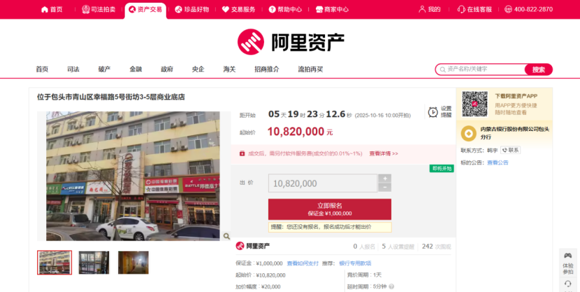 日前,阿里资产交易平台显示,内蒙古银行包头分行持有的一宗抵债商业房产将于10月16日公开拍卖,起拍价1082万元。