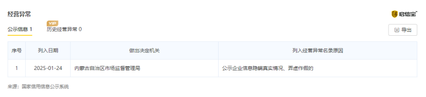 公开信息显示,今年1月24日,内蒙古银行因存在“公示企业信息隐瞒真实情况,弄虚作假”行为,被内蒙古自治区市场监督管理局列入经营异常名录。
