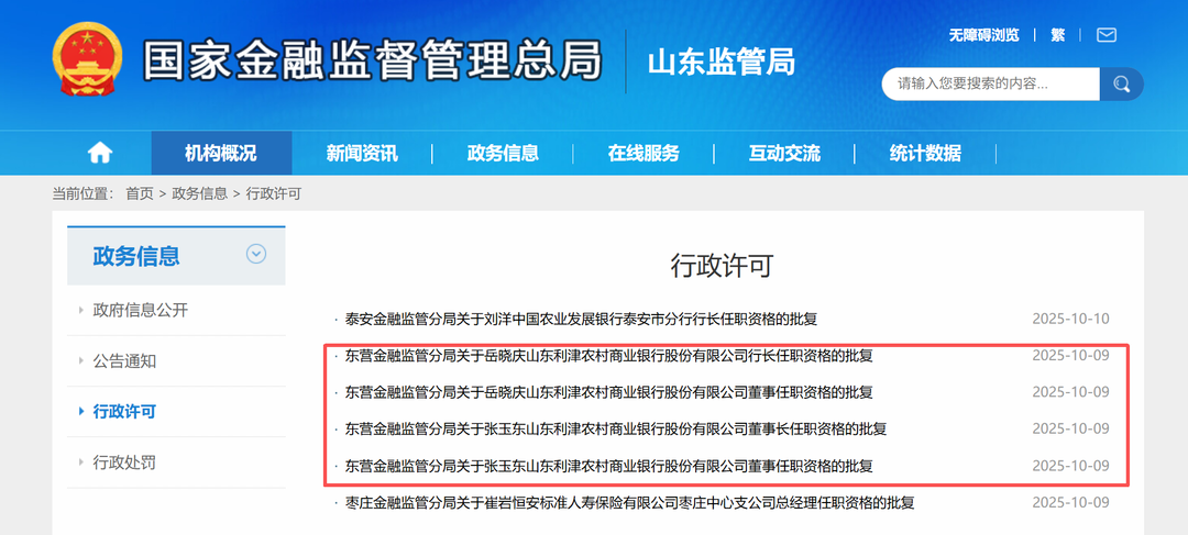 10月9日,国家金融监督管理总局山东监管局发布公告称,东营监管分局已核准张玉东利津农商银行董事长、董事的任职资格,核准岳晓庆东利津农商银行行长、董事的任职资格,批复时间均为2025年9月30日。