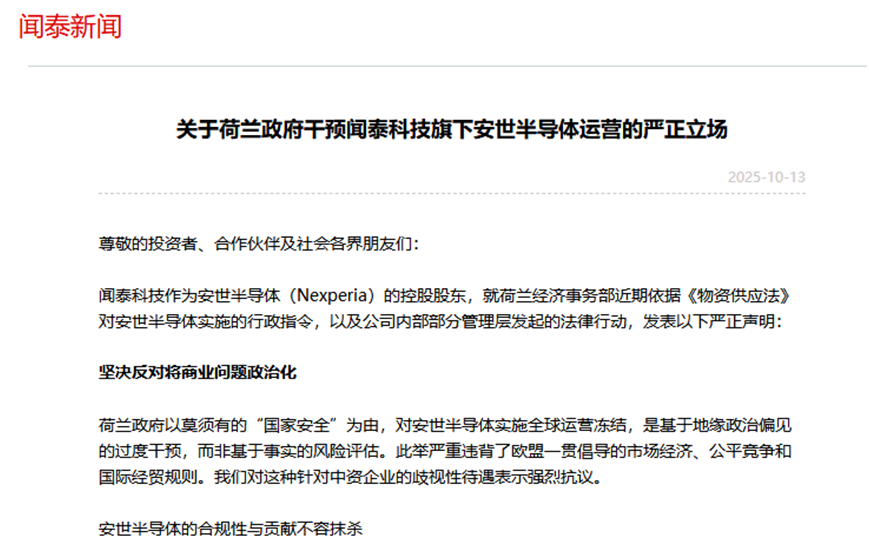 同时,闻泰科技谴责安世半导体个别外籍管理层试图通过法律程序强行改变安世半导体股权结构,其诉求与荷兰政府指令高度联动,本质是借政治压力剥夺股东权利、颠覆公司合法治理结构。闻泰科技对此类以“合规”为名、行夺权之实的行为予以谴责。