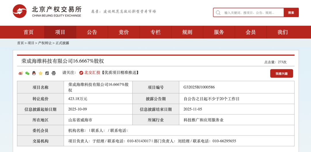 北京产权交易所近日正式披露荣成海维科技有限公司16.6667%股权挂牌转让信息,转让底价为423.18万元,转让方为中广核华瑞科技有限公司。这也意味着,中广核华瑞科技有限公司要退出该公司。