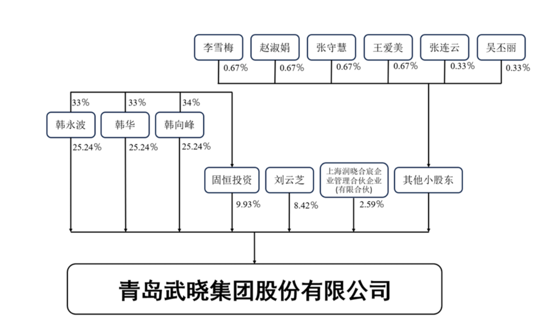 股权结构方面,韩华直接持有武晓集团25.24%的股份,并担任董事长兼总经理,韩向峰与韩永波均持有该公司股份25.24%并担任董事。青岛固恒财富投资有限公司(下称“固恒财富”)持有该公司9.93%股份,刘云芝持有8.42%的股份。