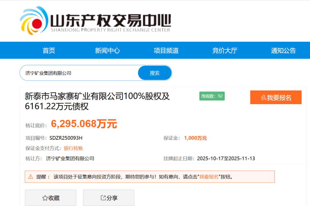 10月17日,新泰市马家寨矿业有限公司(下称“马家寨矿业”)100%股权及6161.22万元债权在山东产权交易中心挂牌转让,转让方为济宁矿业集团有限公司(下称“济宁矿业”),转让底价6295.068万元。在今年9月份,济宁矿业曾挂牌转让马家寨矿业,当时转让底价6309.94万元。