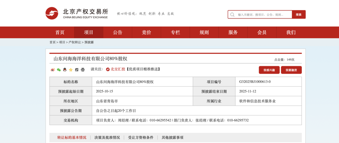 北京产权交易所近日预披露山东问海海洋科技有限公司(下称“问海海洋”)80%股权出让信息,出让方为中国电子系统技术有限公司(下称“中国系统”)。