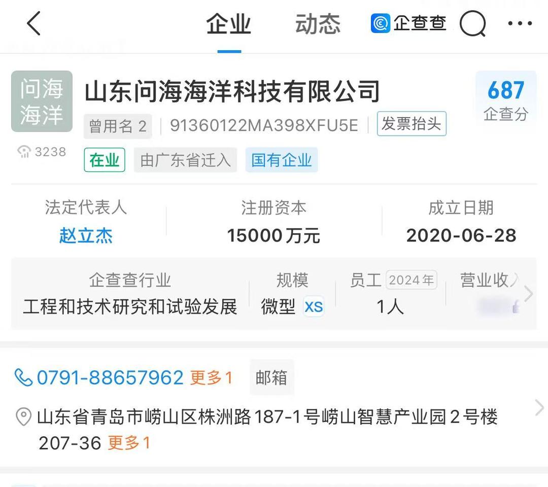 问海海洋成立于2020年6月,注册资本为1.5亿元,现注册地位于青岛市崂山区,系由广东省迁入青岛的国有企业,法定代表人赵立杰,今年10月11日由深圳市云数智科技有限公司更名而来,经营范围也由之前的技术服务、技术开发、技术咨询等变为海洋生物活性物质提取、纯化、合成技术研发等。财务数据显示,截至今年8月31日,问海海洋实现净利润4566.24万元。