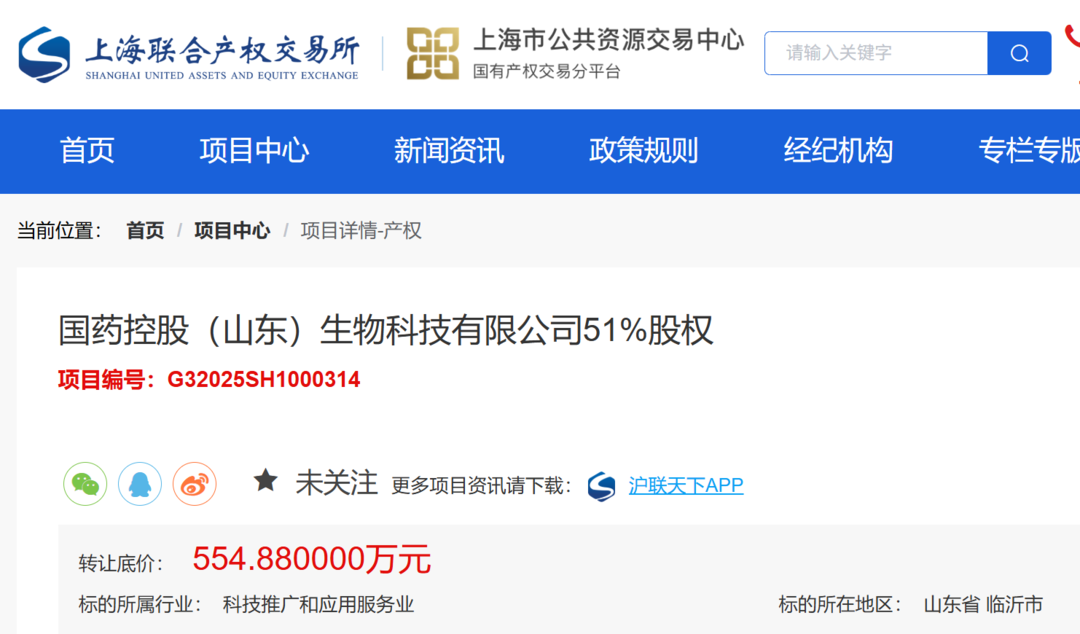 近日,国药控股(山东)生物科技有限公司(下称“国药山东生物”)51%股权在上海联合产权交易所挂牌转让,转让底价为554.88万元,转让方为国药集团化学试剂有限公司(下称“国药化学试剂”)。这也意味着国药集团要退出国药山东生物。
