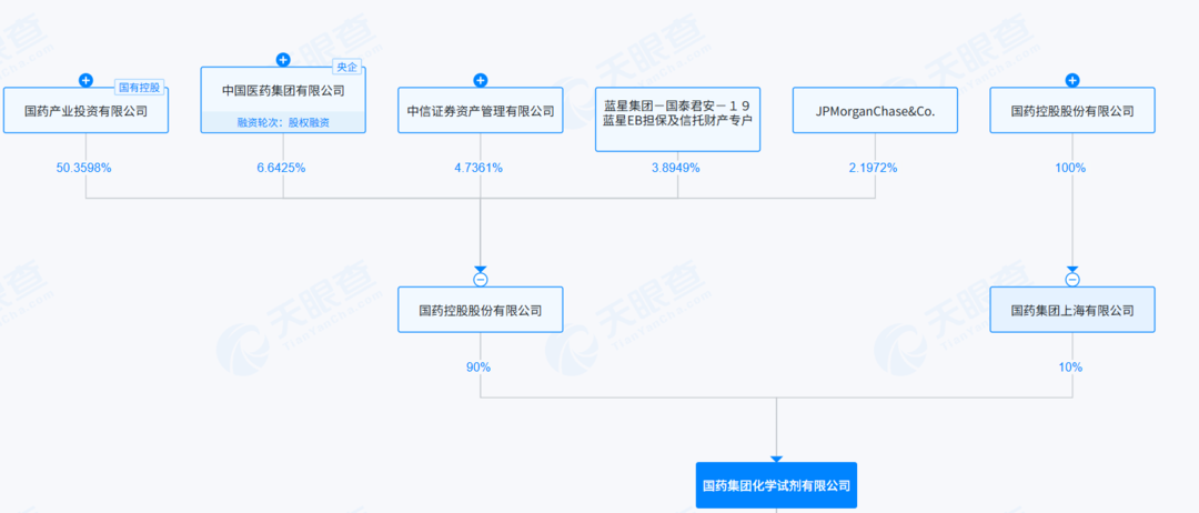 从国药化学试剂股权结构看,国药控股股份有限公司持有其90%的股权,国药集团上海有限公司持有10%股权。