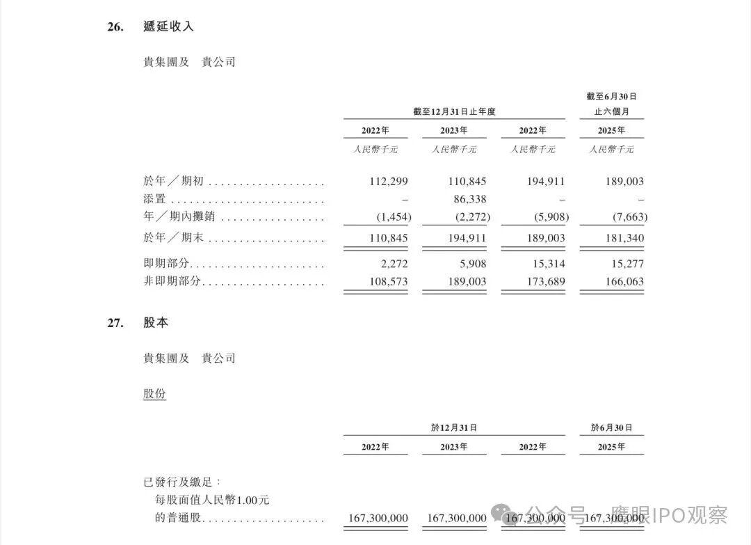 例如,在“递延收入”“股本”及“合约承担”等表格中,同样出现了两个“2022年”的年份标注,且对应数据不同。