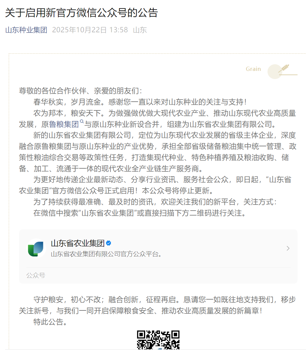 10月22日,山东种业集团微信公众号发布公告,为更好地传递企业最新动态、分享行业资讯、服务社会公众,即日起,“山东省农业集团”官方微信公众号正式启用。