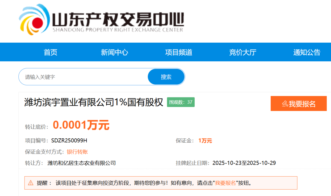 10月23日,潍坊滨宇置业有限公司(下称“滨宇置业”)1%国有股权在山东产权交易中心挂牌转让,转让底价0.0001万元,转让方为潍坊和亿居生态农业有限公司(下称“潍坊和亿居”)。