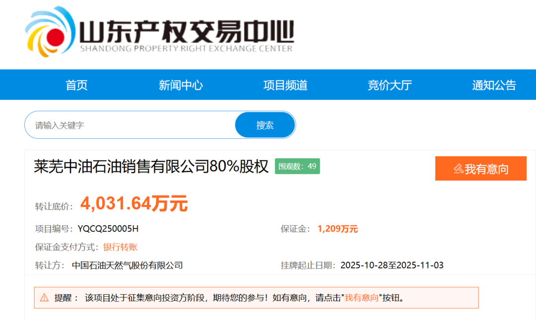 10月28日,莱芜中油石油销售有限公司(下称“莱芜中油”)80%股权在山东产权交易中心挂牌,转让方为中国石油天然气股份有限公司(下称“中国石油”,证券代码:601857.SH),转让底价4031.64万元。