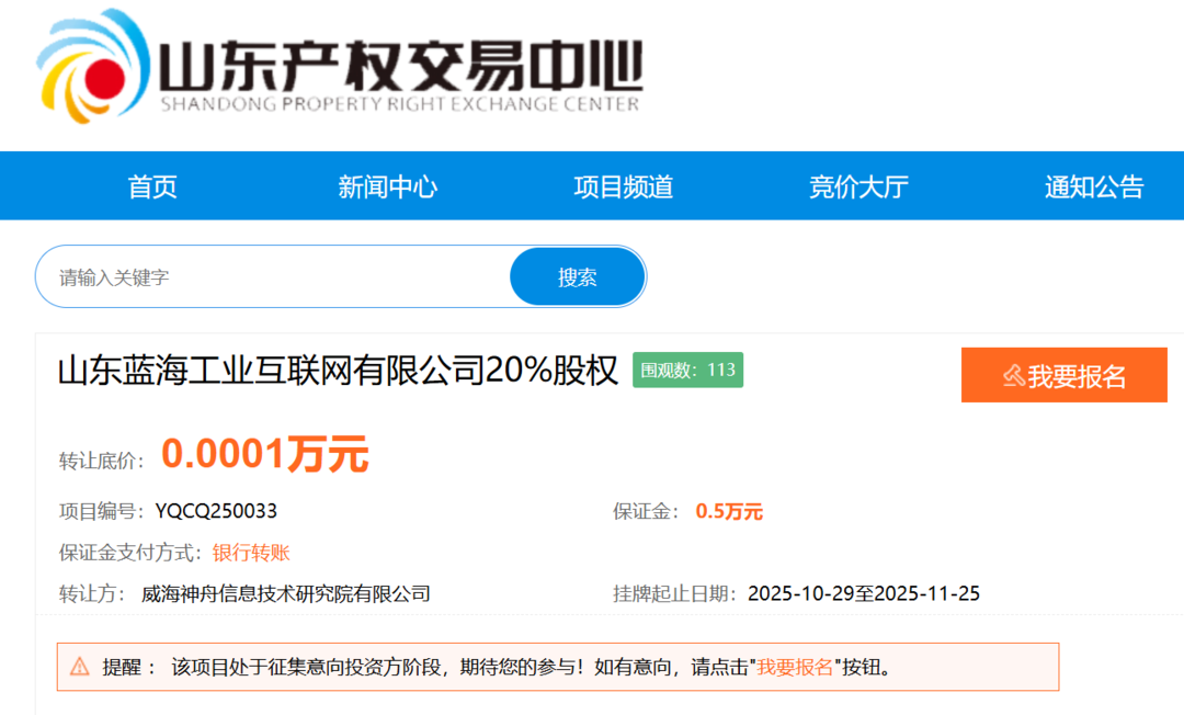 10月29日,山东蓝海工业互联网有限公司(下称“蓝海工业互联”)20%股权在山东产权交易中心挂牌转让,转让底价0.0001万元,转让方为威海神舟信息技术研究院有限公司(下称“威海神州信息”)。