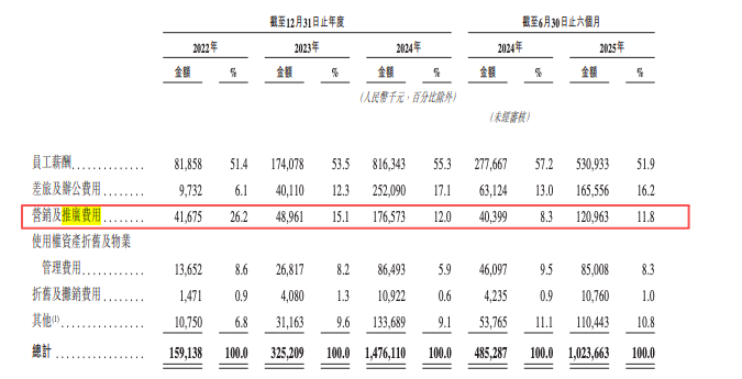 值得一提的是,虽毛利率持续处于较低水平,鸣鸣很忙营销推广费用却有所上升。2024年,公司营销及推广费用为1.77亿元;今年上半年为1.21亿元,相比去年同期的4039.9万元增长199.42%。