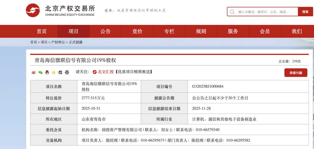北京产权交易所正式披露青岛海信微联信号有限公司19%股权转让信息,转让方为北京交大微联科技有限公司,转让底价2777.515万元。