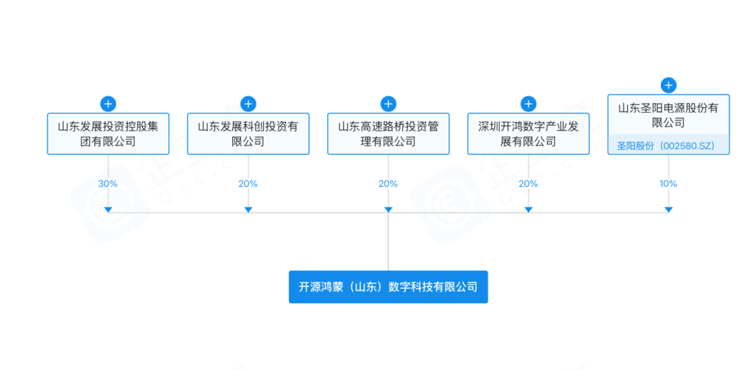 股权穿透显示,山东发展集团认缴出资1500万元,持股30%;山东发展科创投资有限公司认缴出资1000万元,持股20%;山东高速路桥投资管理有限公司投资认缴出资1000万元,持股20%;深圳开鸿数字产业发展有限公司认缴出资1000万元,持股20%;圣阳股份(002580.SZ)认缴出资500万元,持股10%。在本次交易中,山东发展集团为圣阳股份控股股东,山东发展科创投资系山东发展集团全资控股子公司。