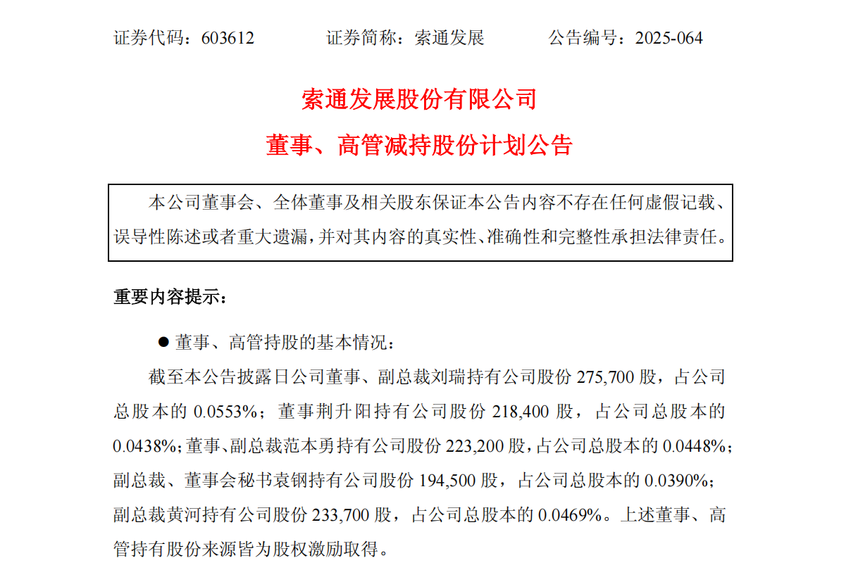 高位“减持”大军再增一员——索通发展(603612.SH)11月10日公告称,公司董事、副总裁刘瑞,董事荆升阳,董事、副总裁范本勇,副总裁、董事会秘书袁钢,副总裁黄河减持公司股份。