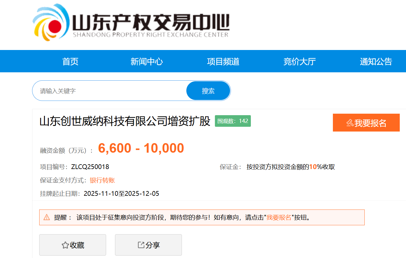 近日,山东创世威纳科技有限公司(下称“山东创世威纳”)增资扩股项目在山东产权交易中心挂牌,拟融资金额6600万元到1亿元,募集资金主要用于后续资本运作、生产科研项目投入、固定资产投入及补充其他流动资金,增强企业市场竞争力。