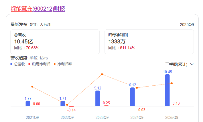 绿能慧充三季报显示,前三季度公司实现营业总收入10.45亿元,同比增长70.68%;归母净利润1337.65万元,同比扭亏;扣非净利润1226.91万元,同比扭亏。
