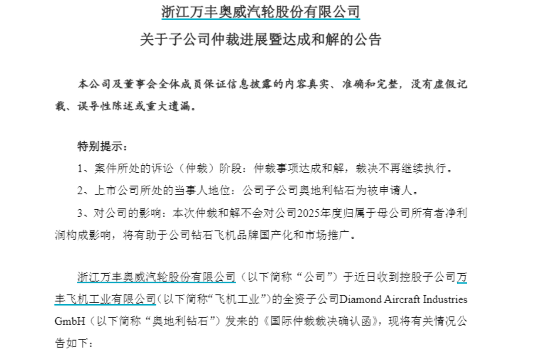 对于本次仲裁和解对公司的影响,万丰奥威表示:“本次仲裁和解不会对公司2025年度归属于母公司所有者净利润构成影响,将有助于公司钻石飞机品牌国产化和市场推广。”