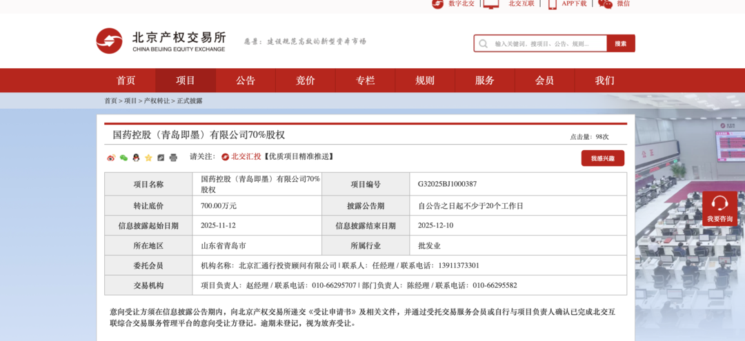 11月12日,国药控股(青岛即墨)有限公司70%股权在北京产权交易所正式挂牌转让,转让底价700万元。这也意味着,继8月15日进行预披露信息后,控股方国药控股山东有限公司此次要正式退出该公司。