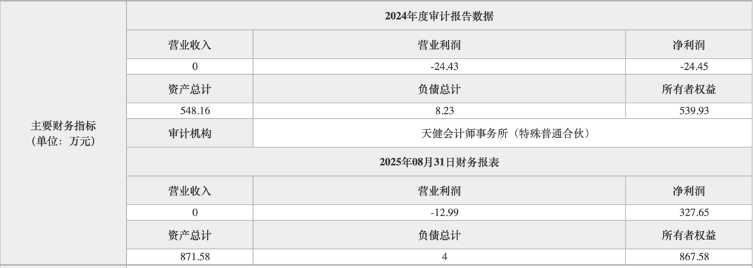 截至今年8月31日,公司营业收入为0元,营业利润为-12.99万元,净利润327.65万元,资产总计871.58万元,负债总计4万元,所有者权益为867.58万元。