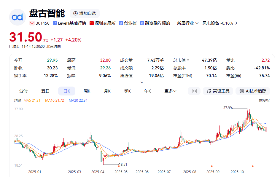公开信息显示,盘古智能成立于2012年,注册资本约1.5亿元,位于青岛市城阳区。公司是一家主要从事集中润滑系统及其核心部件研发、生产与销售的国家级技术企业,致力于发展具有自主知识产权和核心竞争力的集中润滑系统,为国内外客户提供有竞争力的设备集中润滑系统整体解决方案。公司于2023年7月14日在深交所创业板上市,发行价为37.96元/股,上市首日,盘古智能股价盘中创下上市最高价58.88元/股,此后股价一路震荡下跌。该股目前处于破发状态。