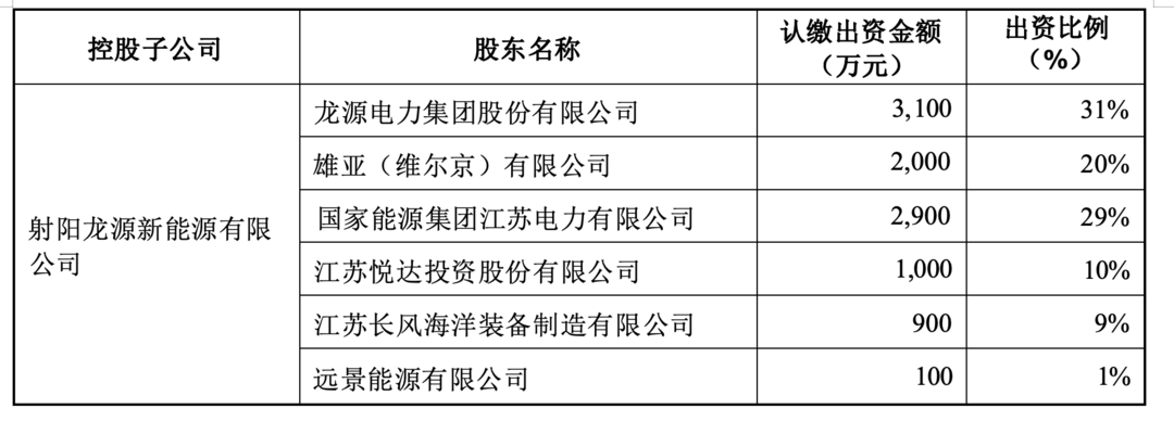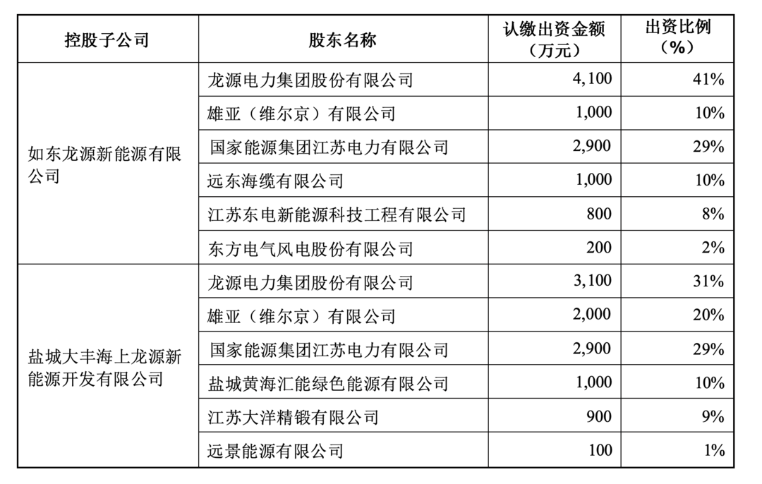 公告显示,如东龙源新能源有限公司、盐城大丰海上龙源新能源开发有限公司以及射阳龙源新能源有限公司注册资本都是1亿元,主要投资人投资规模与持股比例也一致:龙源电力及其全资子公司雄亚公司共同出资5100万元,持股占比51%;国能江苏电力出资2900万元,持股占比29%;其他股东合计出资2000万元,持股占比20%。