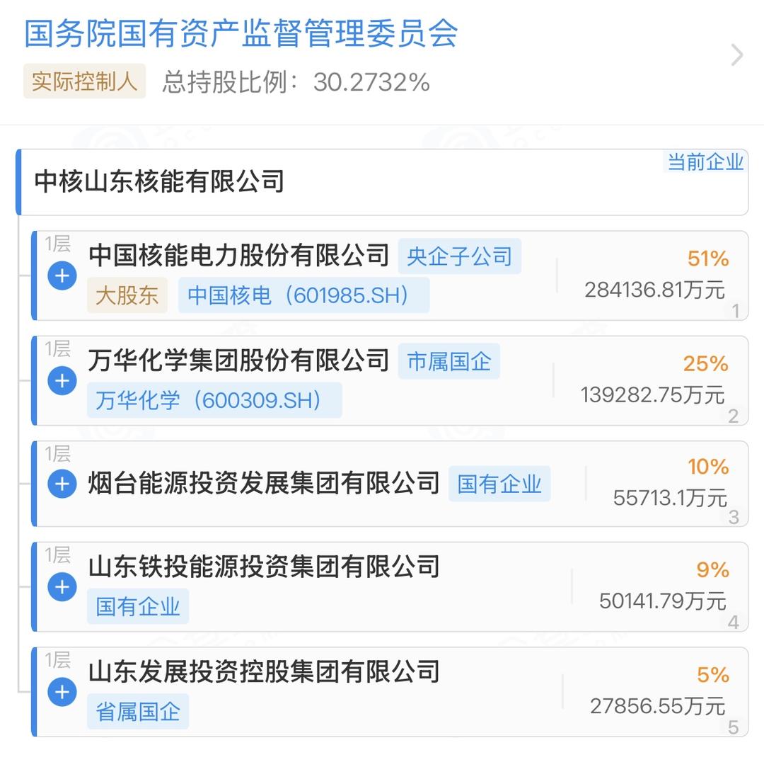 中核山东核能有限公司成立于2021年9月,注册资本为55.71亿元,法定代表人也是洪源平。股权穿透显示,中国核电、万华化学(600309.SH)、烟台能源投资发展集团、山东铁投能源投资集团、山东发展投资控股集团分别持股51%、25%、10%、9%、5%。