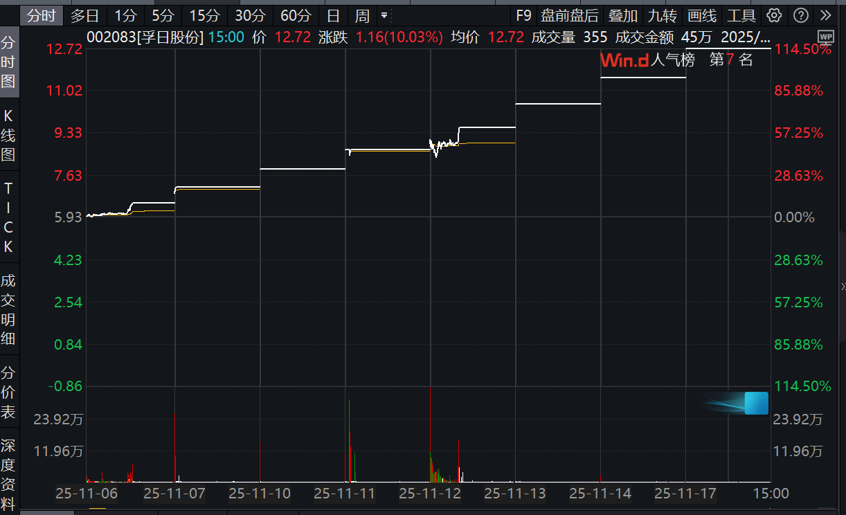 11月17日,孚日股份“一字板”涨停,报收于12.72元/股,全天换手率0.65%,成交量6.12万手。至此,该股已连收8个涨停板。