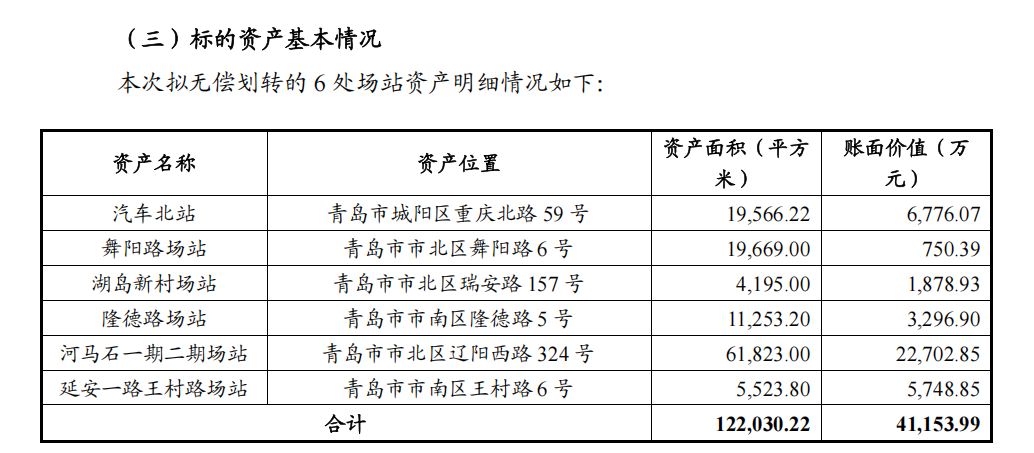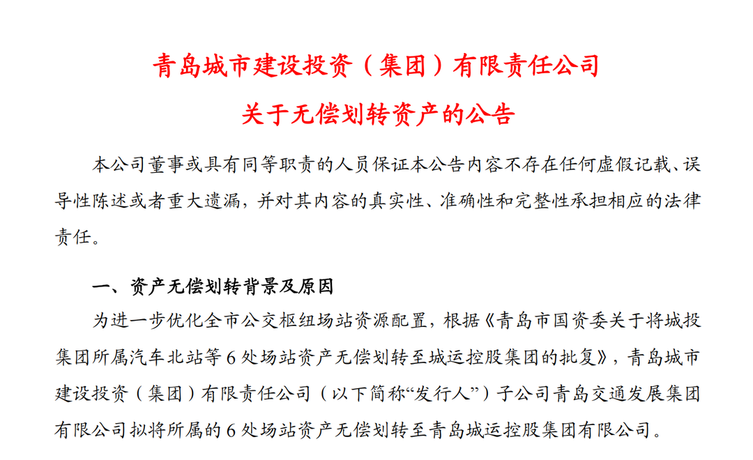11月17日,青岛城市建设投资(集团)有限责任公司(下称“青岛城投集团”)发布无偿划转资产的公告,为进一步优化全市公交枢纽场站资源配置,根据青岛市国资委相关批复,青岛城投集团子公司青岛交通发展集团有限公司拟将所属汽车北站、舞阳路场站、湖岛新村场站、隆德路场站、河马石一期二期场站、延安一路王村路场站6处场站资产无偿划转至青岛城运控股集团有限公司。