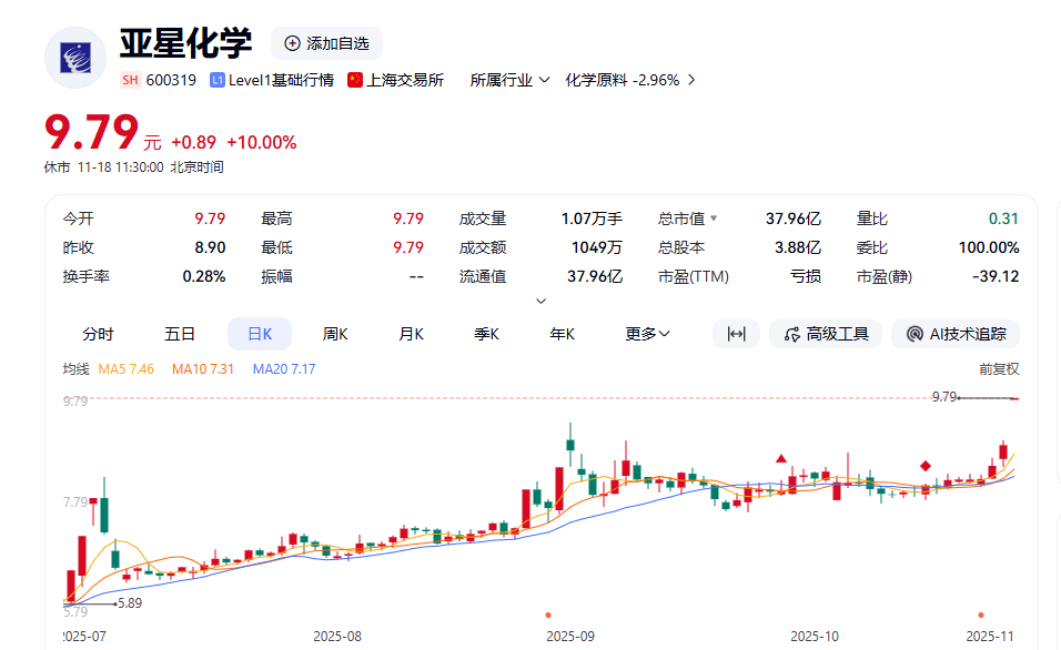 11月18日,复牌后的亚星化学开盘一字涨停,截至中午收盘,报收9.79元/股。