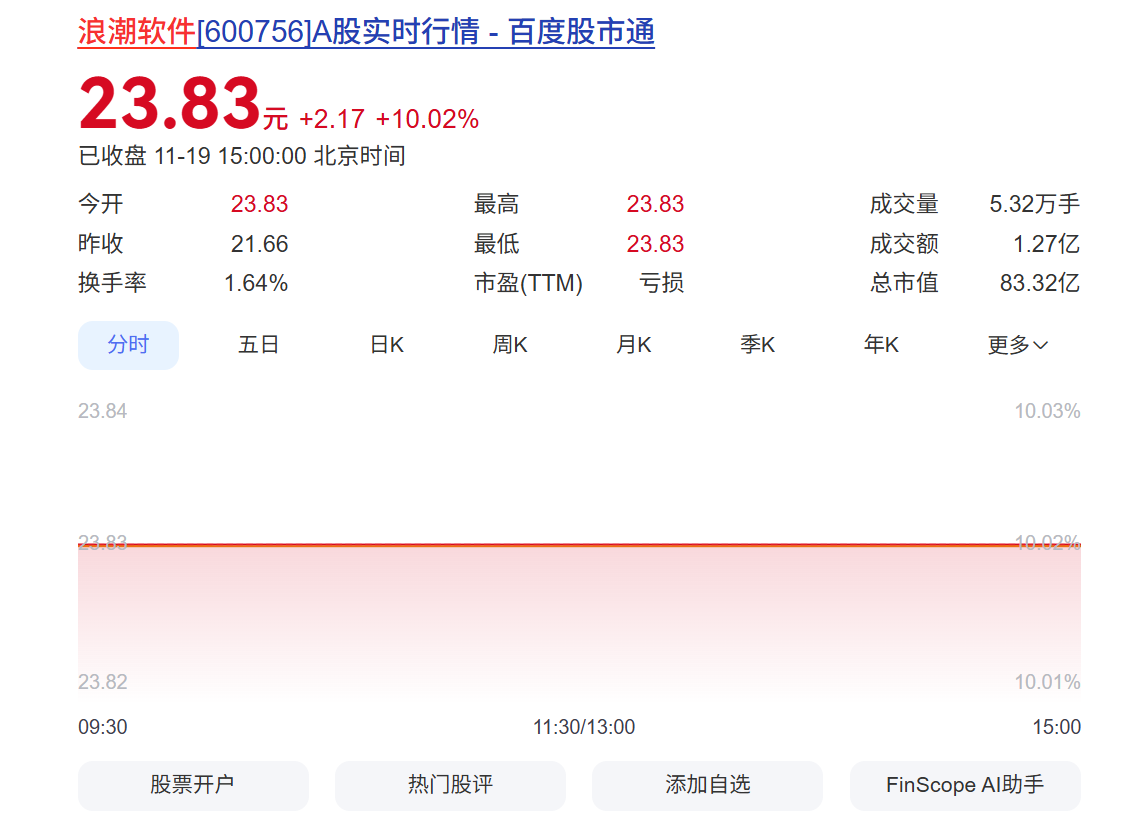 11月19日,浪潮软件(600756.SH)开盘即封至涨停,报收23.83元/股,涨幅为10.02%。此前的两个交易日(11月17日、18日),其股价均涨停,至此已连收3个涨停板。