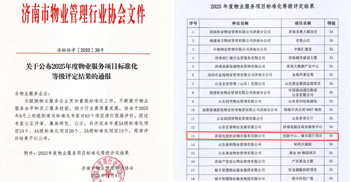 近日,济南市物业管理行业协会发布了《关于公布2025年度物业服务项目标准化等级评定结果的通报》,由济南先投积余城市服务有限公司(下称“先投积余”)提供全业态物业服务的创新中心、城市展厅项目凭借规范的管理体系、优质的服务品质与坚实的安全保障,顺利通过本次评审,成功斩获“5A级项目”荣誉称号,标志着项目物业服务水平迈入行业顶尖行列。