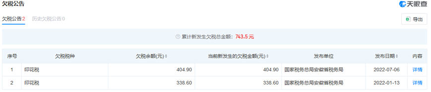 令人不解的是,天眼查显示,2022年,公司因为欠税被国家税务总局安徽省税务局两次公告,欠税金额分别为338.60元和404.9元。金额虽然不大,但也说明公司的财务内控制度及财务人员水平有所欠缺。