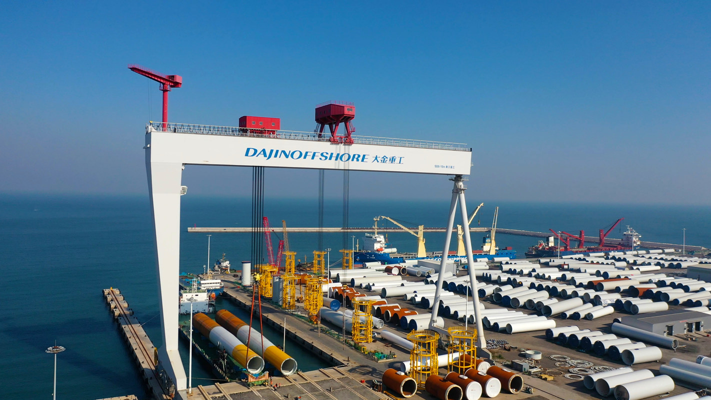 据媒体报道,蓬莱大金是大金重工的山东蓬莱生产基地,产能50万吨,是全球风电海工单体最大工厂,是大金重工两海战略(海上风电和海外市场)的实施主体,蓬莱基地自有大件运输码头,码头岸线、水深条件优良,对出口海上风电产品的厂内物流、装船发运、起重能力优势明显,是蓬莱基地的核心竞争力,是较早涉足国内海上风电塔筒、单桩、过渡段、导管架等产品生产制造的企业,在行业内形成较高的知名度和良好的信誉度。码头共建设5个泊位,目前对外开放的泊位共3个,2个10万吨级顺岸泊位,水深达14.4米,1个3.5万吨级凹槽泊位,水深9.7米,配备起重能力1000吨的龙门吊,2个10万吨级泊位尚未对外投入使用。可直接将超大超重产品从工厂直接发运至国内外码头以及海上风场,为大金重工“海上+海外”两海战略的实施以及高质量的交付保驾护航。