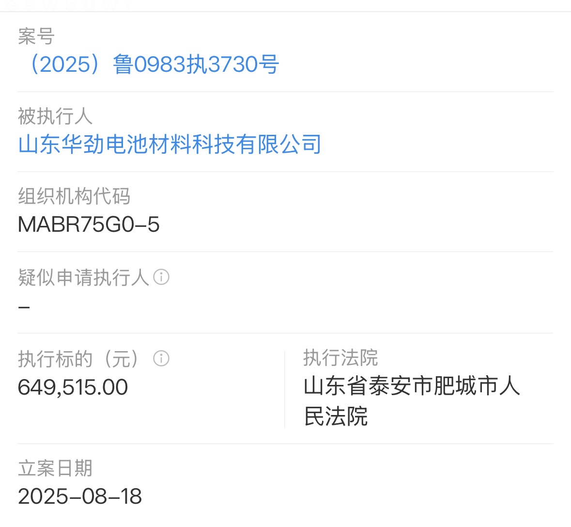 由肥城城投产业投资有限公司参股(持股比例4.76%)的山东华劲电池材料科技有限公司,计划投资1亿元在肥城市石横镇化工产业园区建设锂电池回收新材料项目。该公司成立于2022年7月,注册资本1.05亿元,大股东为宁夏汉尧富锂科技有限责任公司(持股比例95.24%)。不过企查查信息显示,今年8月18日,该公司被肥城市人民法院列入被执行人,执行标的达64.95万元。