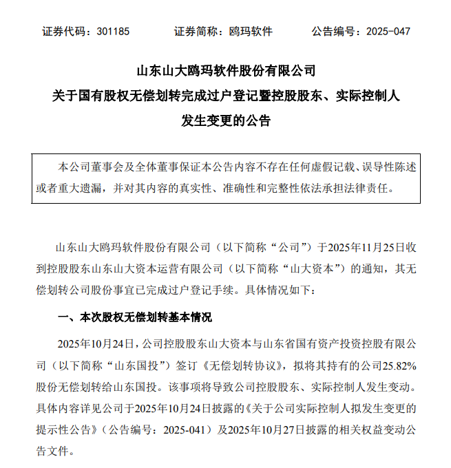 11月25日,两家公司均表示,收到山大资本的通知,相关无偿划转公司股份事宜已完成过户登记手续。